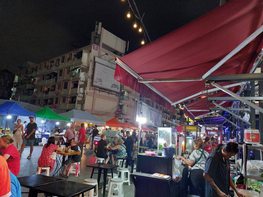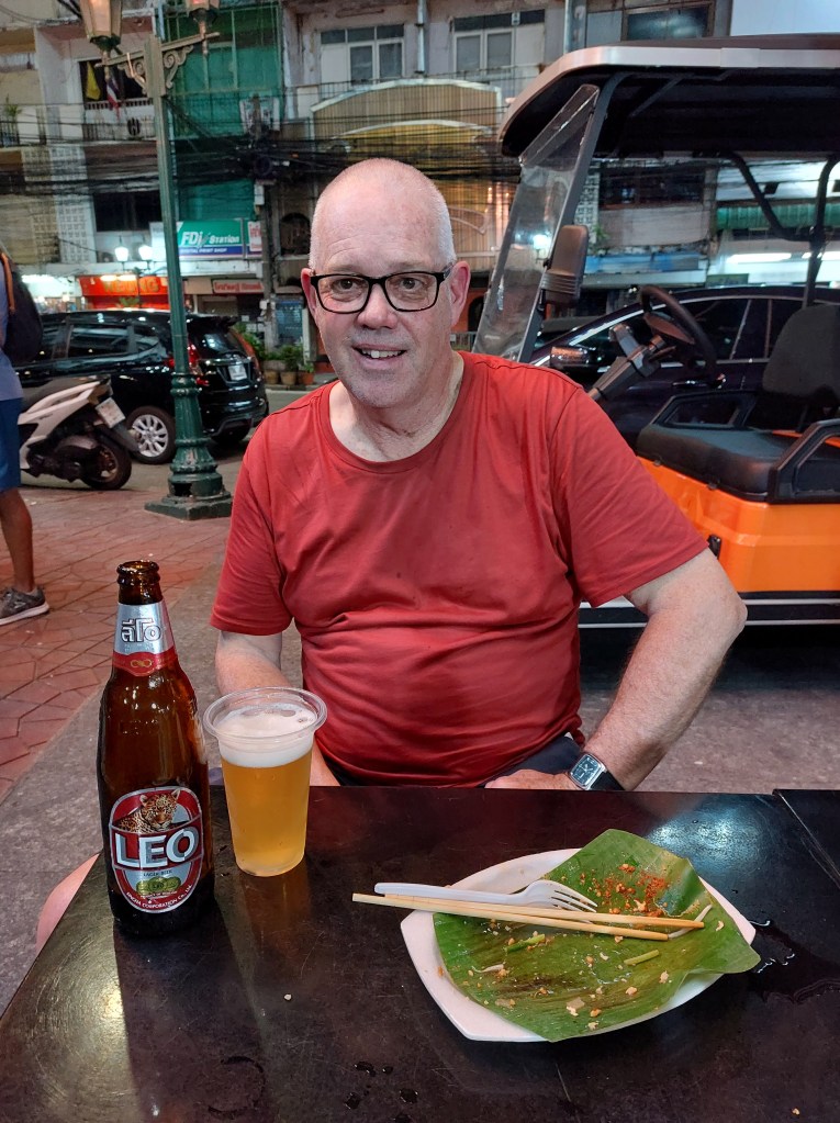 The place is pumping, sort of Bangla Road at Phuket without the bar girls and ping pong shows. We find a table, an amiable waiter and order a padthai and a chicken rice stir fry with a big Leo beer each. Its stick hot, the food has a nice spice to it, the sound is abit loud but after 2 large Leo’s (a full strength Singha beer) I’m not worrying.