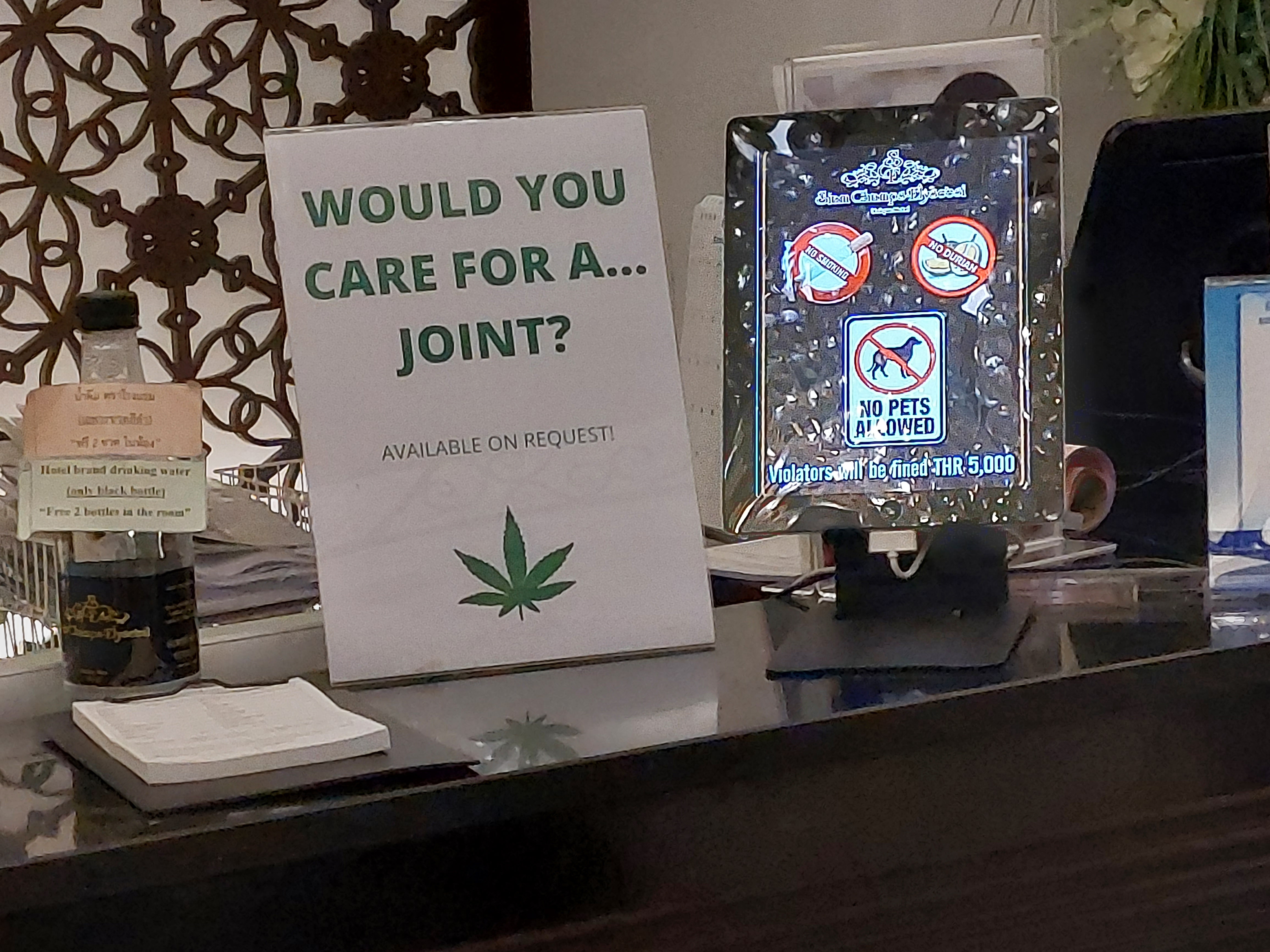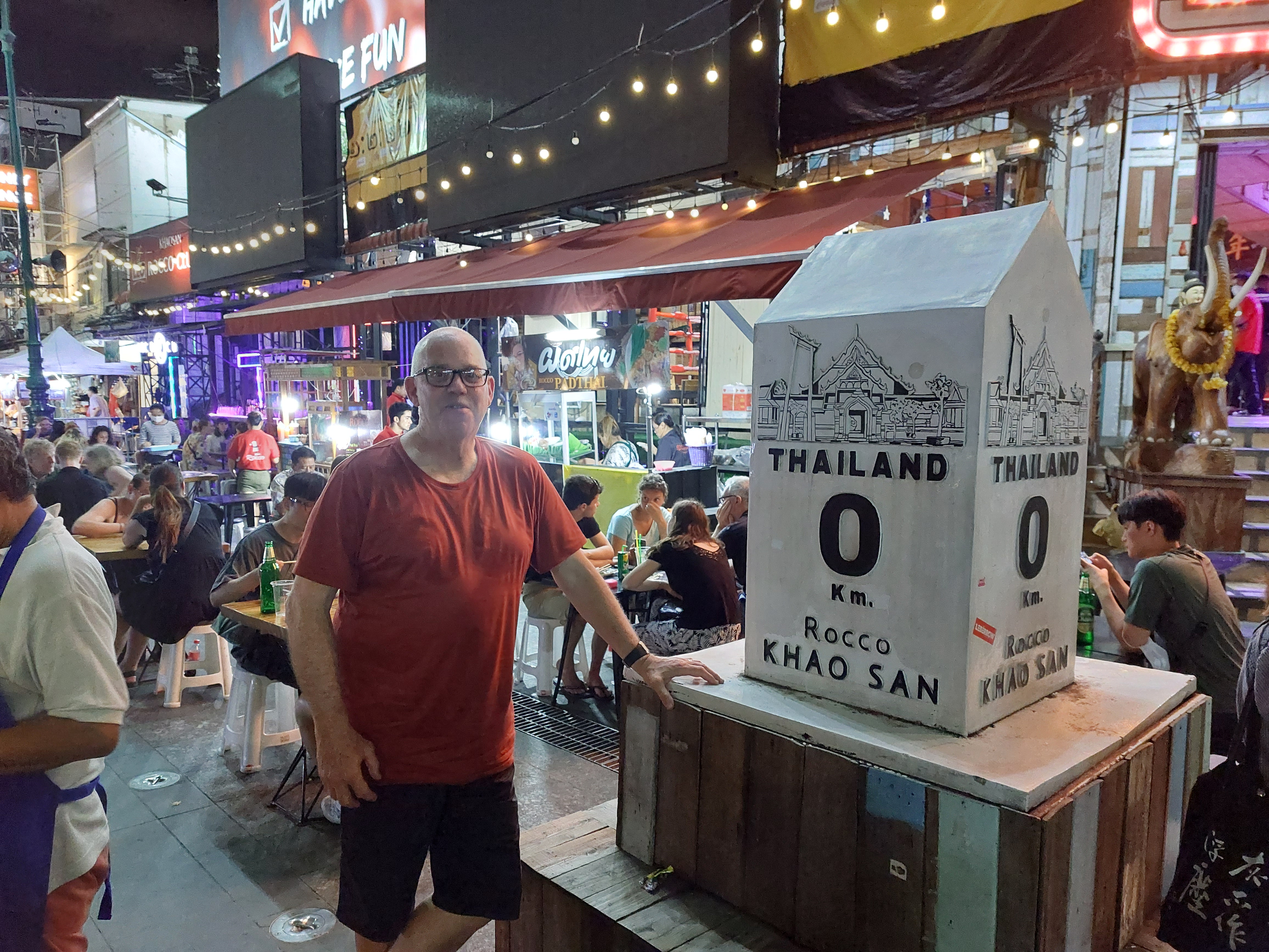 The last bit into Bangkok we can see green and paddy fields, and buildings everywhere. There is a little confusion as we come off the plane trying to work out where immigration is and where you pick up bags, but oodles of Thai women in tight uniforms sort us all out, and we find ourselves with our bags at Exit gate 3-4 and sign with our names on it. a nice drive in a flash black Honda hybrid sedan to our hotel the Siam Champs Elysee Hotel. Google Mpas off line maps are treat. Its in the old Bangkok town, not far from Khoasan Road so a quick check in, sort the wifi,call home and then wander to Khoasan Road for a a meal and a beer.