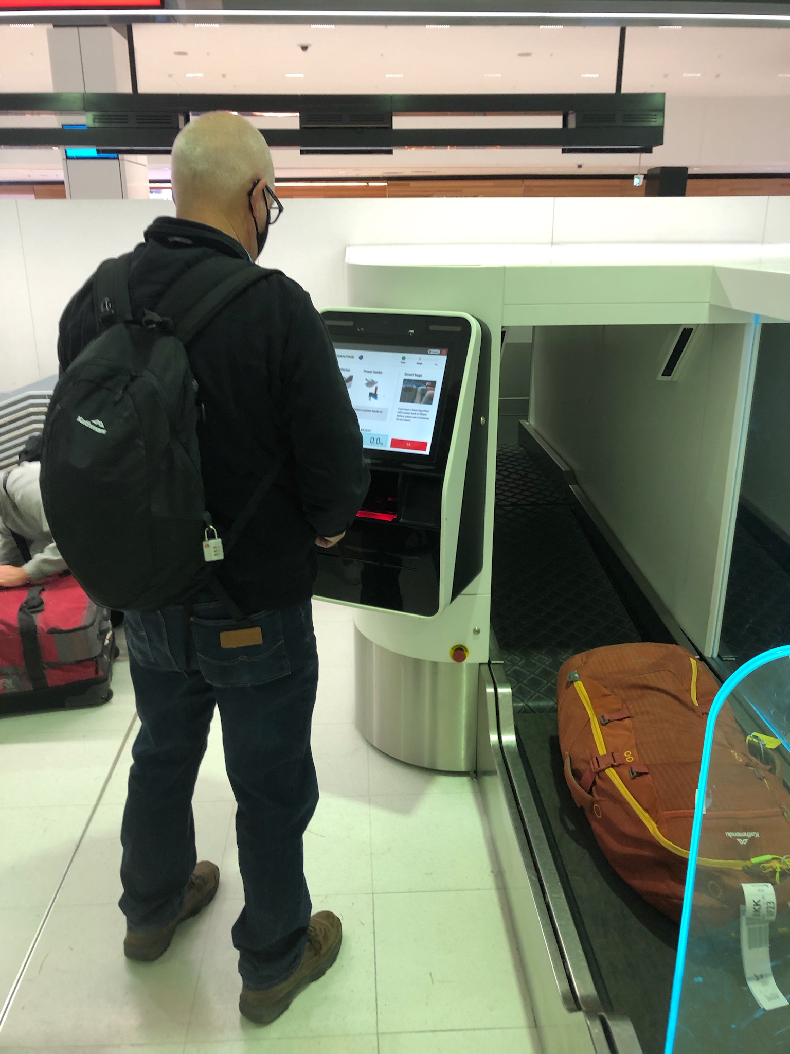 An early start, we get to Qantas checkin at 6.15am, who said I sleep in! Now we aren”t Business Class or Qantas Club so we don’t get to go to see a human being, we get sent to a roped off pen with machines and some pleasant women to help us master the technology. I read the screen as I’m going through the process, I’m feeeling confident as just last night I mastered the Maccas ordering screen and assisted Dale with his order, but it says you cant check in power packs,you have to take them in carry on luggage, I’m warm (sweating in my Kathmadu polar fleece), I take my bag off, unlock the lock but then cant get the lock off because the cable tie is blocking it. F…..!, So calm down Pauolo, unlock the small compartment, find scissors, cut cable ties, scrummage around find battery f….g pack, tidy up, lock it all up and start the check in over again. Feel like I’ve just arrived in Bangkok, sweat trickling down my neck. Meanwhile the human help has been great, its those f….g machines I hate. Baggage check in next, this nearly brings me undone, the bag is on the scales, but thinks its a backpack (sort of is but isnt) so won’t sent it, the human help comes over and sorts it out. Glad we got there early.