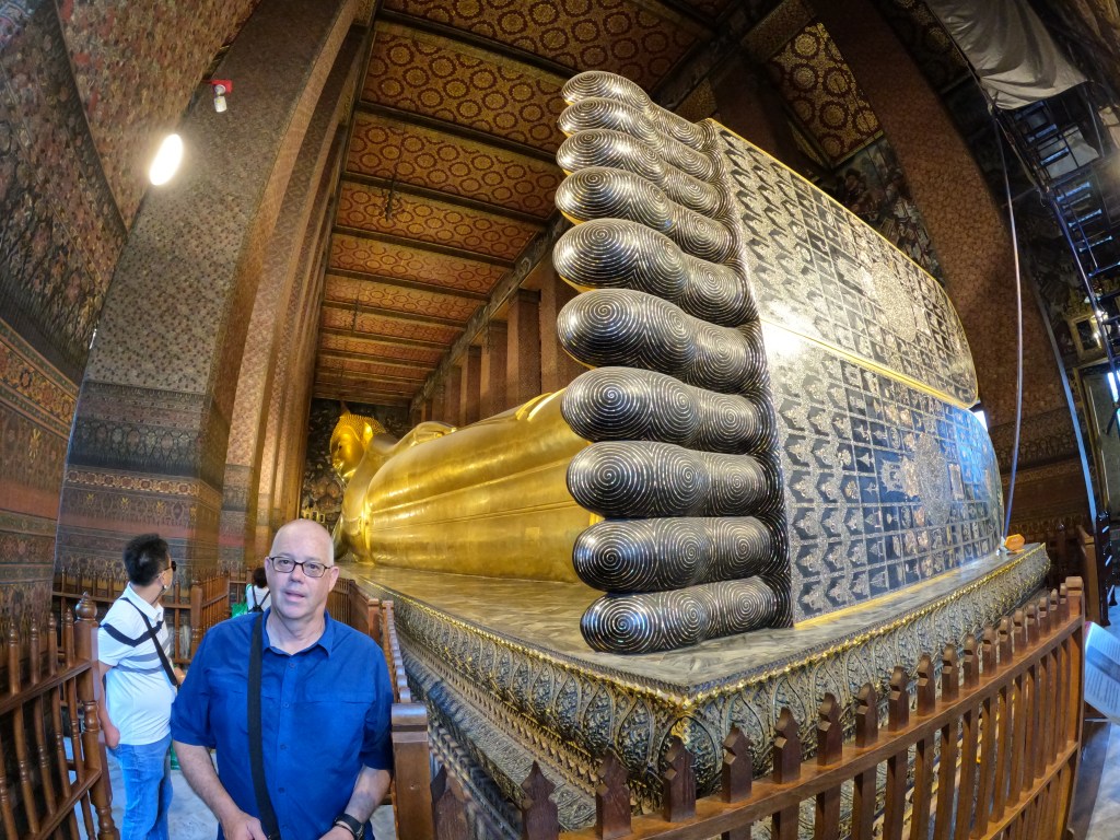 A relatively early start today, for us anyway. Today was an Intrepid paid breakfast at the hotel but their breakfast box is crap so we go to the small convenience shop next door, it has some chips and savoury rolls BUT most important of all they have a small espresso machine. I buy a custard roll and a cappuchino thats strong and full of flavour. Cost 100 baht. We walk a block and get on a local bus to the grounds of Wat Pho where we see the reclining Golden Buddha, he’s a big old gold long lieing down bugger, 46 metres long and 15 metres high built 5-600 years ago. The feet are beautiful, black onyx it looks like with inlaid mother of pearl. The other pagodas around him were built n the 1800’s. Its pretty impressive although I think I like the Emerald Buddha and The Grand Palace better.