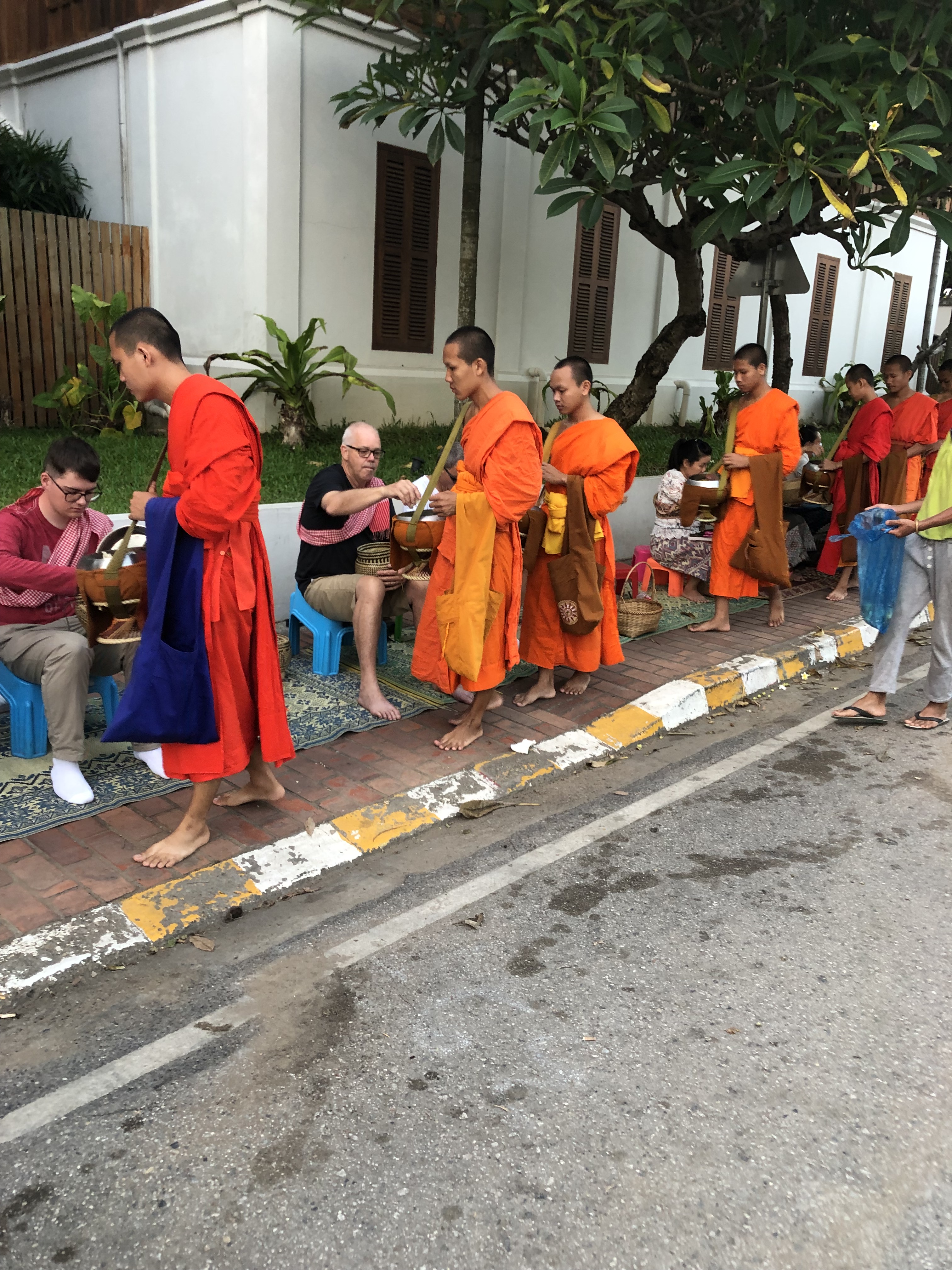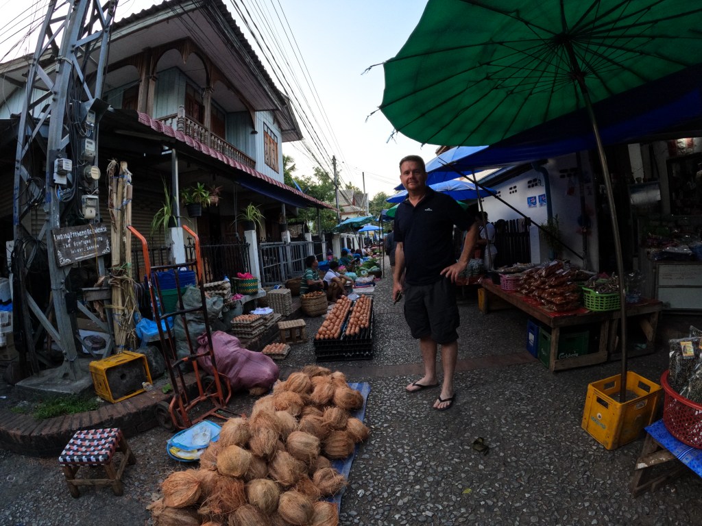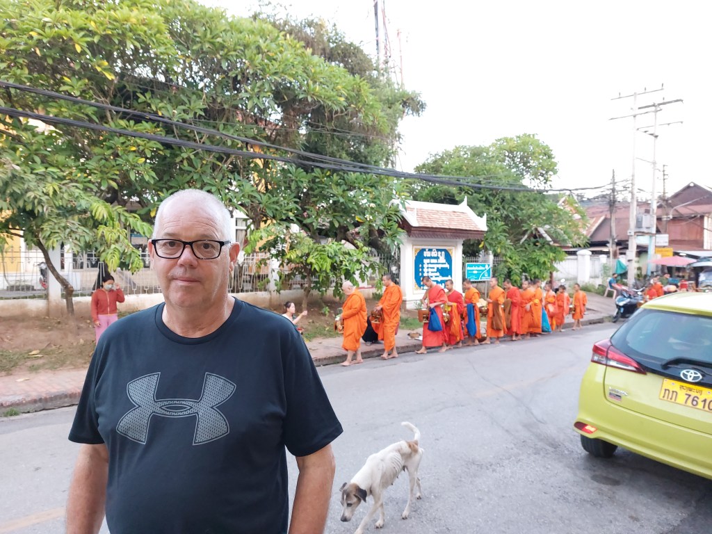 An early start today, up at 4.50am, leave to walk to the street where the locals give alms (food & offerings) to the Buddhist monks. Naa has a spot sorted for us, bowls or better described as baskets of sticky rice and a chair fit for a 2 year old, but we have to sitting. The ritual roughley – Before they arrive, you put a scarf over your left shoulder under your right armpit, you pick your basket up, say a little prayer, they as they have their bowl in front of you you put a small handful in their bowl which may have money or other food in it. You stay quiet, be respectful of the event, this is their food, thy do this every day but today is a special Buddhist day so lots of people are out. They do a few laps and a few of us haven’t got rid of all our rice so we wait for another group of monks to walk past. Its a very quiet serene event and I’m glad I got out of bed early, not normal for me I have to say.