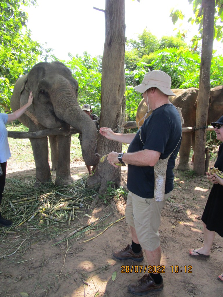 About 30 minutes drive out of Luang Prabang is Mandalao Elephant Rehabilitation Park. It’s run by some Lao locals but setup by an American guy probably early 40’s, to get elephants out of logging camps and tourist parks where they are ridden every day. The saddles affect their reproductive functions and the Lao elephant population, once land on 1 Million Elephants now only has about 5,000. So they own 400 hectares, have to buy the elephants usually old tired females usually at the end of their breeding time but probably not going to reproduce anyway, cost $20-$25,000 US each. They then work on getting the females back to health and fitness and release them to the National Park in groups. The staff are mostly ex mahouts so they know elephants pretty well. The American guy turns up at lunch and is very grateful for Intrepid’s business, he’s an interesting character. There are no chains, no ropes, no hooks, no work, only care and food for these fantastic beasts.