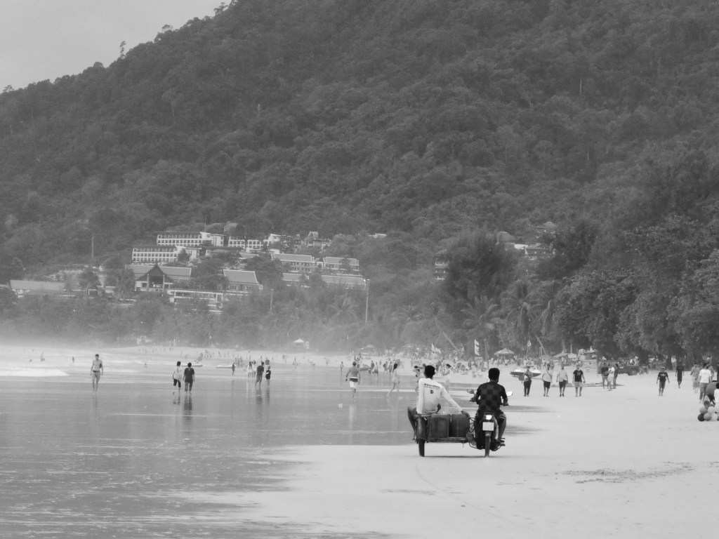 A sunset walk along Patong beach and the place seems busier than when we arrived. There are lots of Indians, lots of people from the middle east, a few caucasion looking people with eastern European languages and some Pom’s and Aussies. The paragliding and jet ski’s are busy, fat and skinny people taking off the beach with jockey size Thai’s guys hanging onto only the ropes steering the parachute. People x 2 or 3 on old popping farting motorbikes with rusting sidecars roaring up and down beach the selling god knows what. Only in Thailand!!!!!