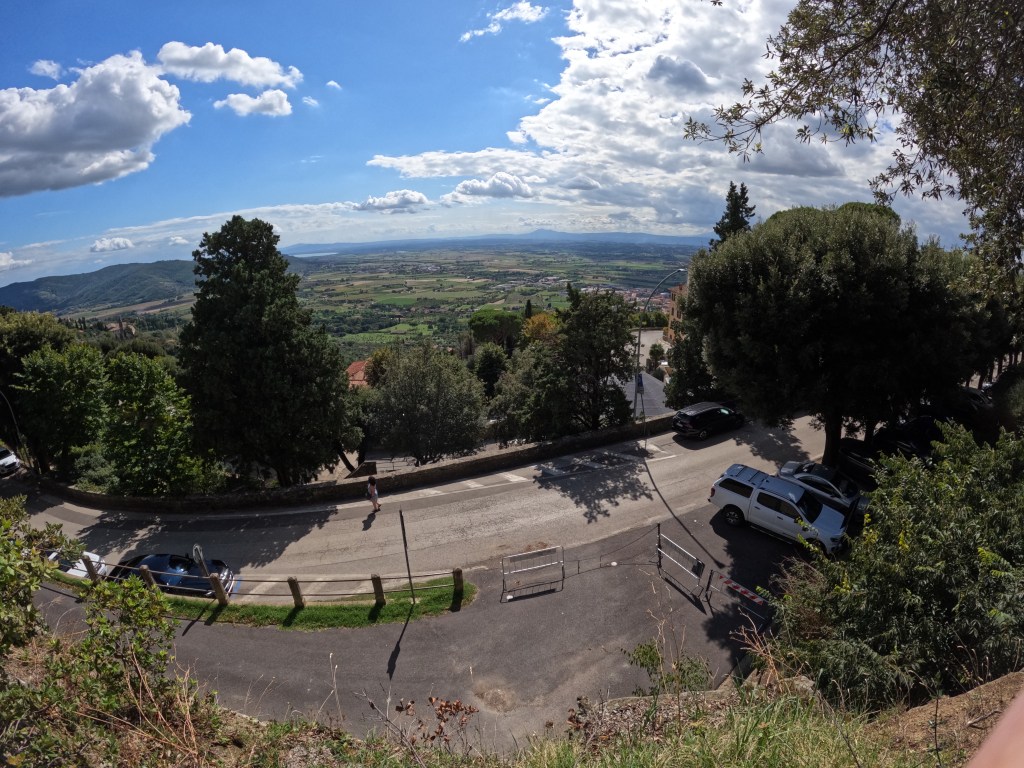 We find there aren’t many people on the train, thats good, so after fanging along at up to 160 km/hour we get to Cortona a few minutes late. Enzo, our van driver, and possibly related to Enzo Ferrari by the way he drives, meets us and gets us to run, he’s late for his next job, and tears up the hill and drops us in Piazza Della Republica right near our accomodation the Hotel Italia. The lady at reception is nice but vague, our rooms change a few times, but when we get to them they are quiet nice. Paul & Liz have a great view over the Tuscan Valley towards Lago Tresimeno.