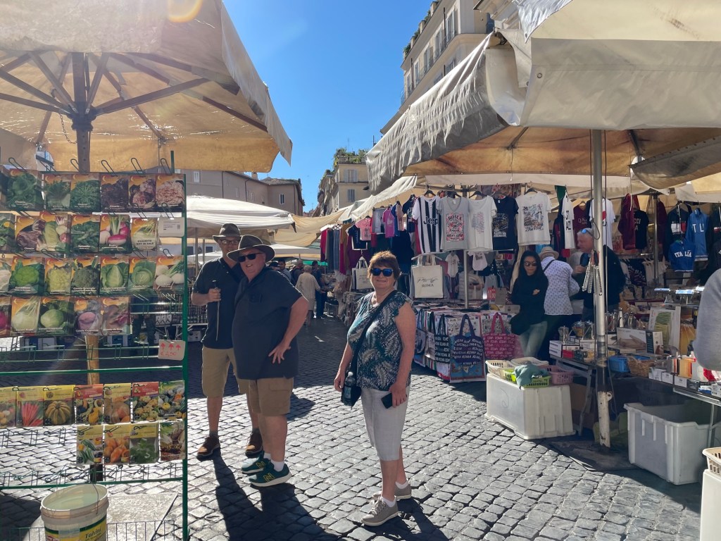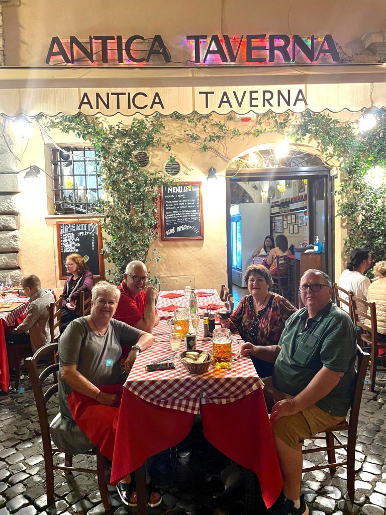 Last night’s dinner was great, another restaurant, great food and good company. The restaurant had some musicians playing in the alley, I guess cost shared by the 4 or 4 other restaurants. There are 2 guitars and a beautiful gypsy waif dancing seductively shaking a tambourine. They play, Led Zeppelin, Dire Straits, Santana, the Eagles, the lead guitar plays finger style like Mark Knopfler, he’s very clever, his voice though is a bit non descript like Knopfler as well, not in a bad way but not a strong big voice. We could stay all night but we don’t. The woman sitting next to us is from Brisbane, a Virgin hostee, sorry steward, and a real estate agent, her father is Italian so she’s visiting family. She loves this part of Rome because it’s so lively, I must say I agree with her.