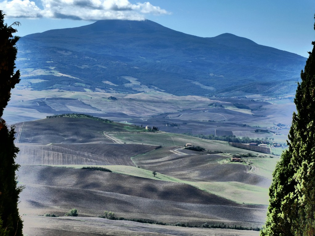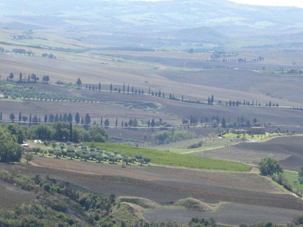 The little Renault fires first start, and with only a few minor driver errors we’re heading to Pienza for the morning. The country, the creamy clay looking soil, has been ploughed up ready for winter crop planting, grapes are being picked, the recent rain has greened up the country and the pencil pines follow roads up to villas sitting on Tuscan hills. Bit hard to take really!