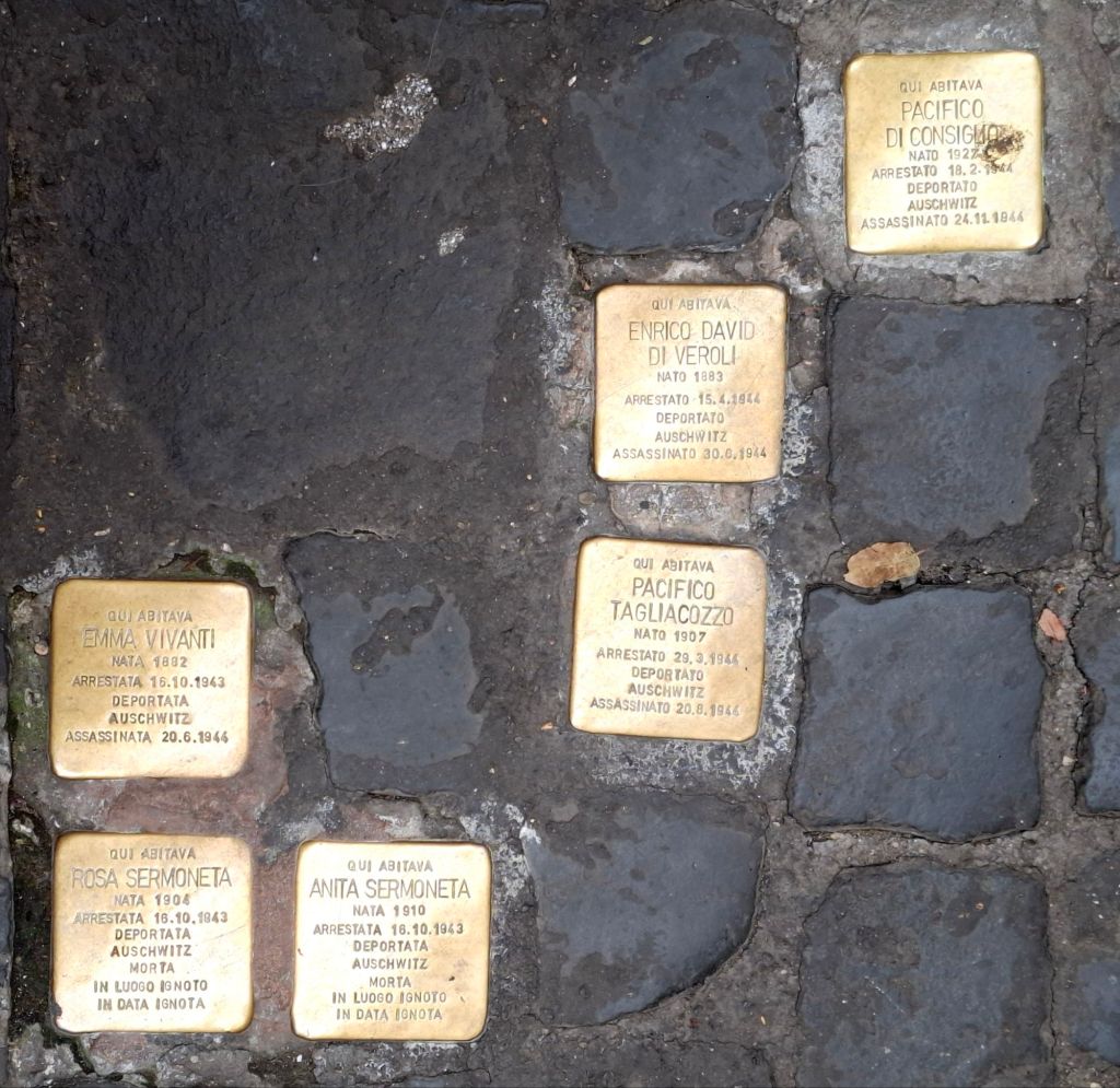 Rome Termini train station is busy, we come into an outside platform and have to walk a mile for a taxi. Our Taxi is expensive but gets us to the Jewish Quarter where our apartment is. There’s a reminder of WWII horrors in the paving outside our front door, 6 Jews from this street who were killed in Auswitz in 1943 have plaques in the pavers.