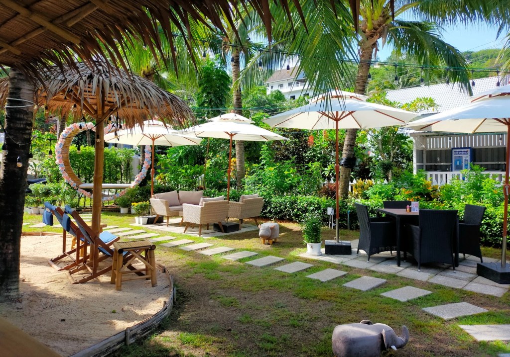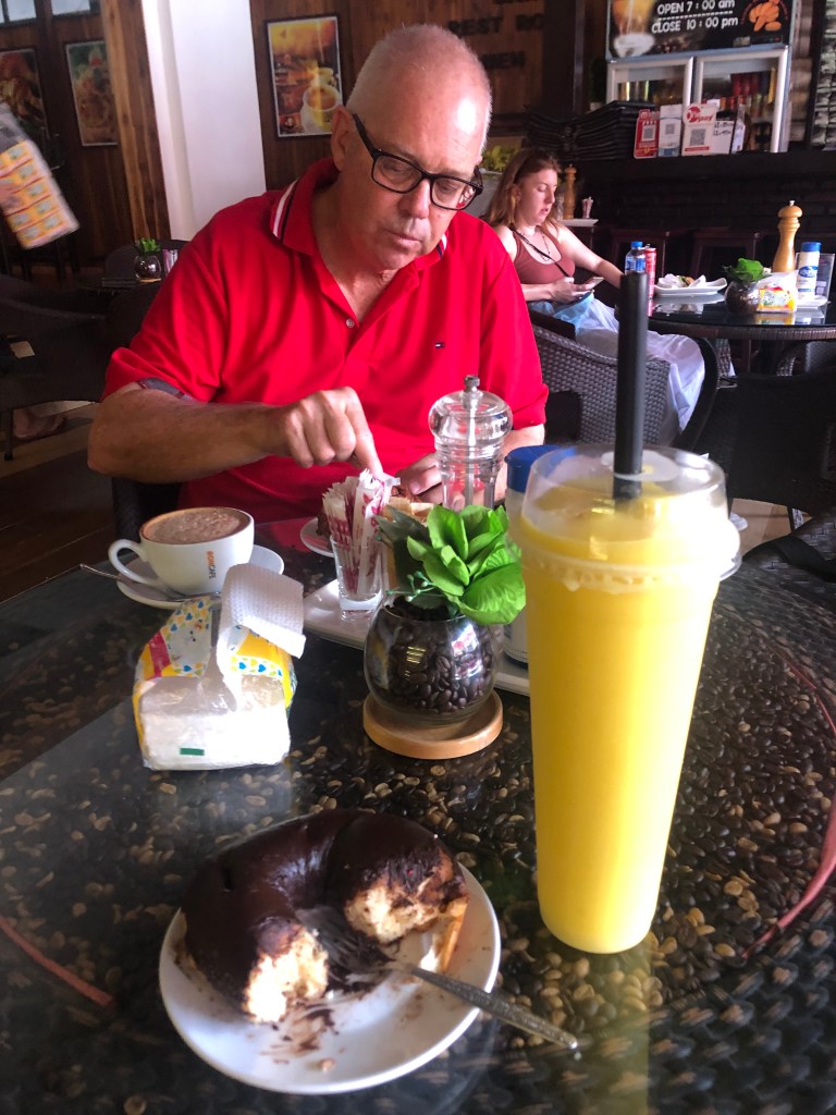 First stop is Maybelle’s Coffee Garden, back of Kata Beach, over looked by The Big Buddha. A lovely garden setting. The story, I discovered Richie and Maybelle on Youtube when checking out how things were on Phuket, he is English 40ish and Maybelle is Thai and 30ish, lovely couple and after Youtube I feel I know them sort of. They have a thriving little business, Maybelle runs it, Richie is PR and public relations. Service great and food and coffee excellent. Maybelle meets us at the gate, shows to a table then Ruchie comes over and had a chat. Seem to be very nice people. We chat to the young woman (late 20s maybe) on the table next door, she’s been in Thailand for 3 months working remotely for a Melbourne recruitment HR company. She is heading home to WA next week. Travelling alone and comfortable in her own skin, good on her. Check out Richie and Maybelle on Youtube.