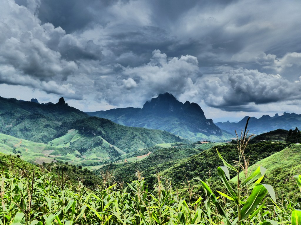 Lunch is at a spot the is 1350 metres above sea level and we climb higher again, maybe to 1500-1600 meters above see level. As we get closer to Vang Vien you can see rice paddies on the lower country.