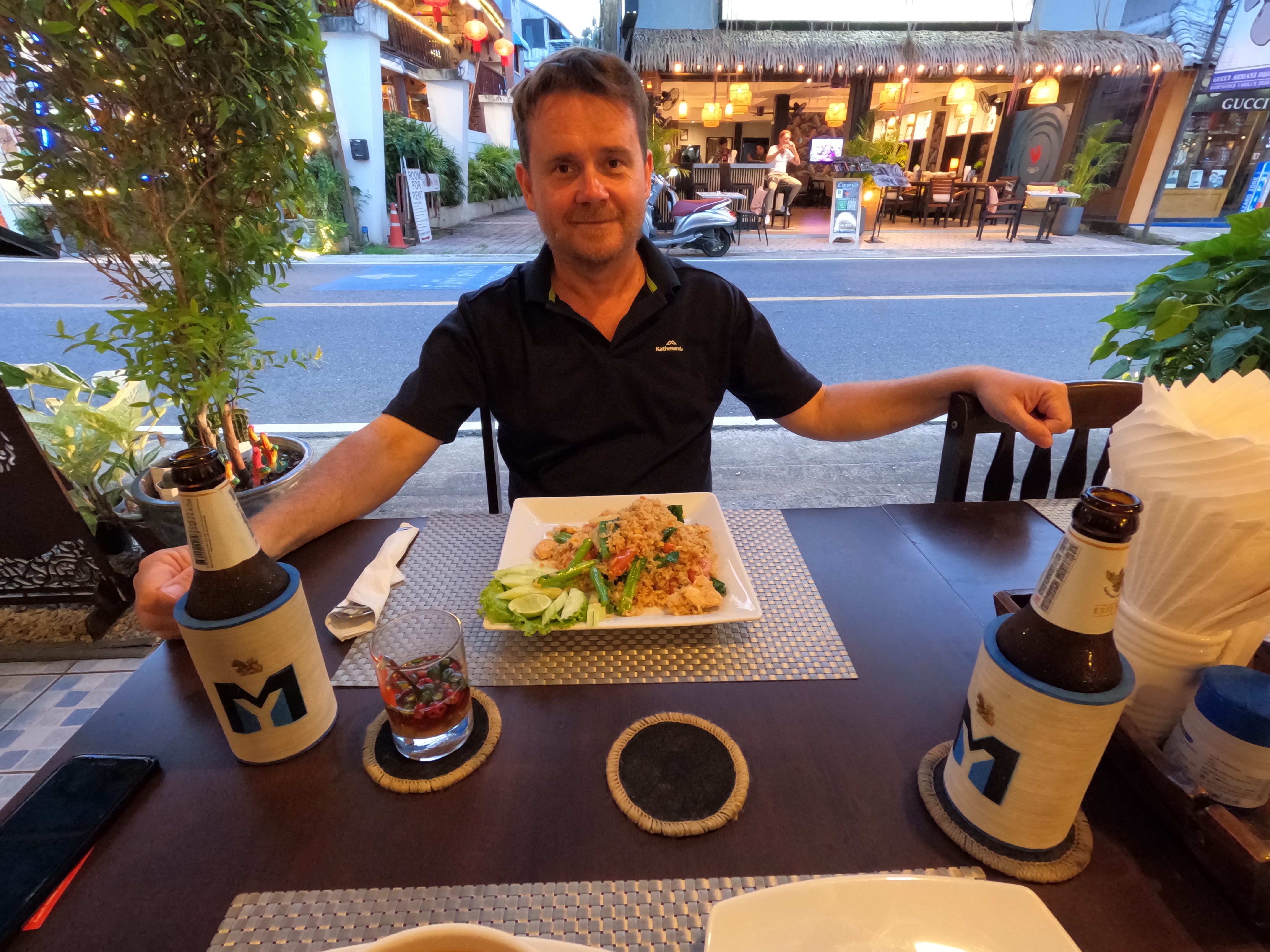 Siam insists on shorting TMM and I dinner, at the restaurant next to Tommy Fashion, its name is Blue Manao, Siam insists the food is super good and fresh. He’s right, Dale (aka TMM) has chicken fried rice (no further comment) but he’s impressed. I have a Chicken Mussaman, I ask for a little spicy – it is delicious and the spiciness is right on my limit, the chilli is dancing on my tongue and my lips are tingling but not numb, there is a little sweat on my cheeks near my nose – they limit was close but not over.