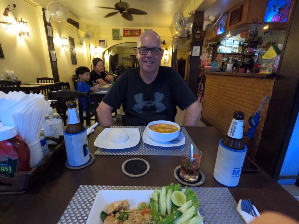 Dinner tonight is at the Banthai restaurant, we want plain food, a Leo and a Singha beer wash done sea bass fish and chips, a very nice meal and the most expensive so far on the trip. Jump (the long time Bathai man) is close by, dale tries to get him to sing but he won’t hear of it. The music is live and the young guy singing Van Morrison’s Moondance sure can play the guitar.