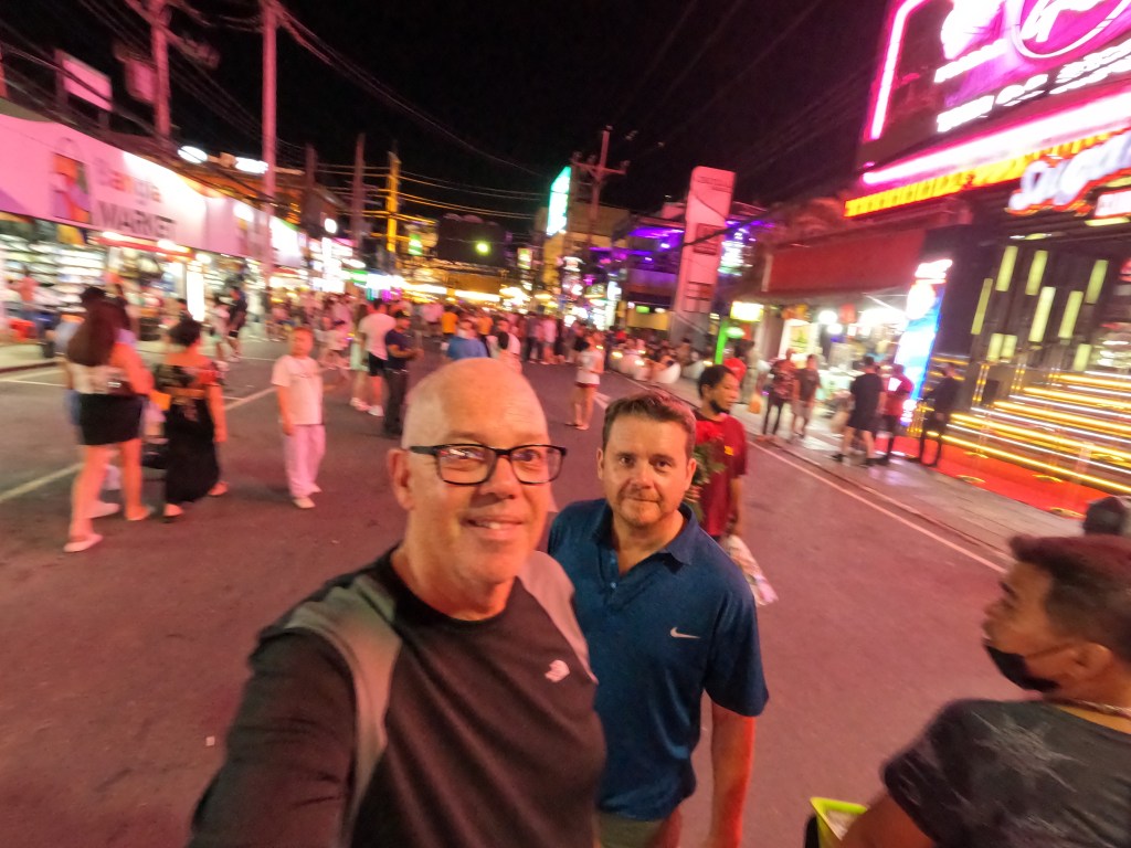 A walk down Bangla Road is in order as we’ve hardly gone more than 50 metres from the hotel today. Same same but not much different, booming music, dancing, go go dancers, ping pong show touts, bar girls tempting lonely men to spend money, what a new concept that is.