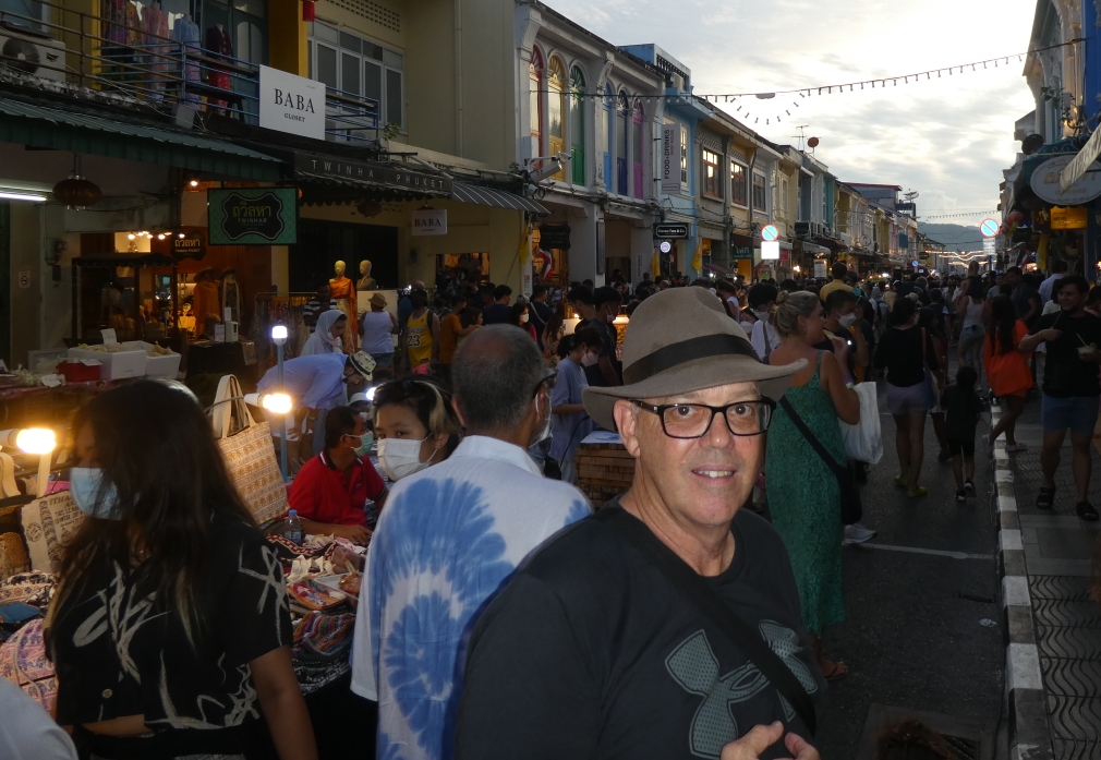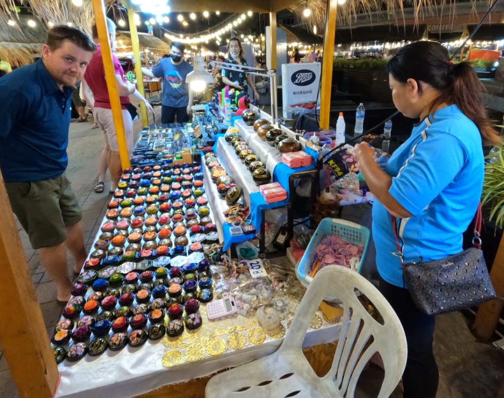 The markets are very nice, there is music, food, lots of original jewellery, clothes and surprise surprise carved soap. We explore, eat, TMM buys stuff, I only buy food BUT at least I bought something. It was pointed out to to me that I need to mention this. The crowd grows the longer we’re there, by the time we leave its a huge crushing crowd, Thai’s, lots of white people and masses of Indians and Middle Eastern people. I’m glad we’re done at 7.30 with the crowd still streaming in, Oz finds us and we’re home in Patong 1/2 and hour later.