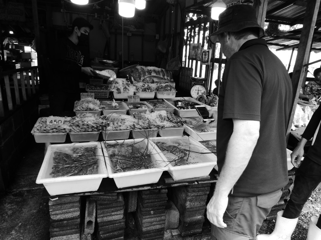 We head to Rawai Beach, Oz pays a local “taxi mafia” kid 5 baht (20c) to park. On the beach side the stalls sell live seafood, on the other side the restaurants will cook what you buy for a small fee, cheap as Oz says “velly cheap”. The long tail boats are anchored behind the stalls in the bay. We walk down the RawI bay shopping area, it looks nice, quiet, lots of the same sorts of shops as Patong only less and smaller. I think lots of nice restaurants for fresh seafood in this area.