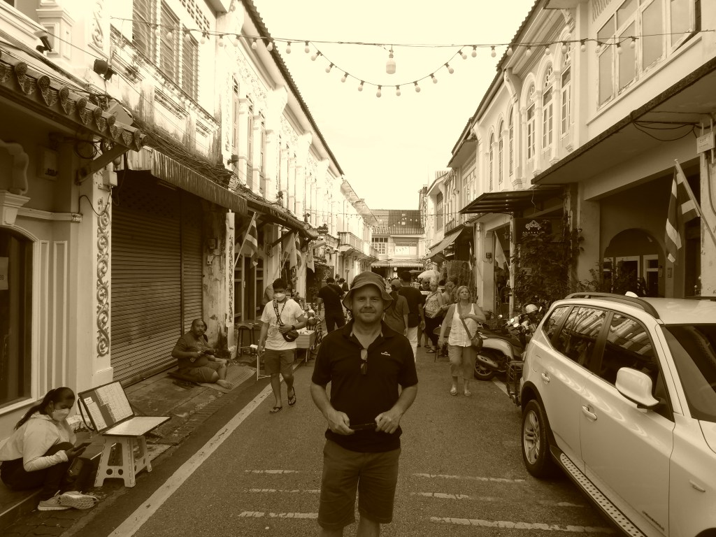 Oz is right on time, we drive over Kathu hill towards Phuket Town which is about 25 km away, we toot at the Buddha (its daylight this time). The history of Phuket was really based around tin mining in the area near Kathu and Phuket Town was originally settled by Siamese, Chinese, Indians, Malays and Sea Gypsies. Europeans came in the 1600’s and Phuket Town grew into a fusion of Chinese Portugese architecture. The bit they didn’t knock down has some beautiful old building. One building where we have something to eat is Baan 125, its stunning inside, there are 3 levels, bottom floor a long shop and the 2nd and 3rd levels are a 4 bedroom hotel.