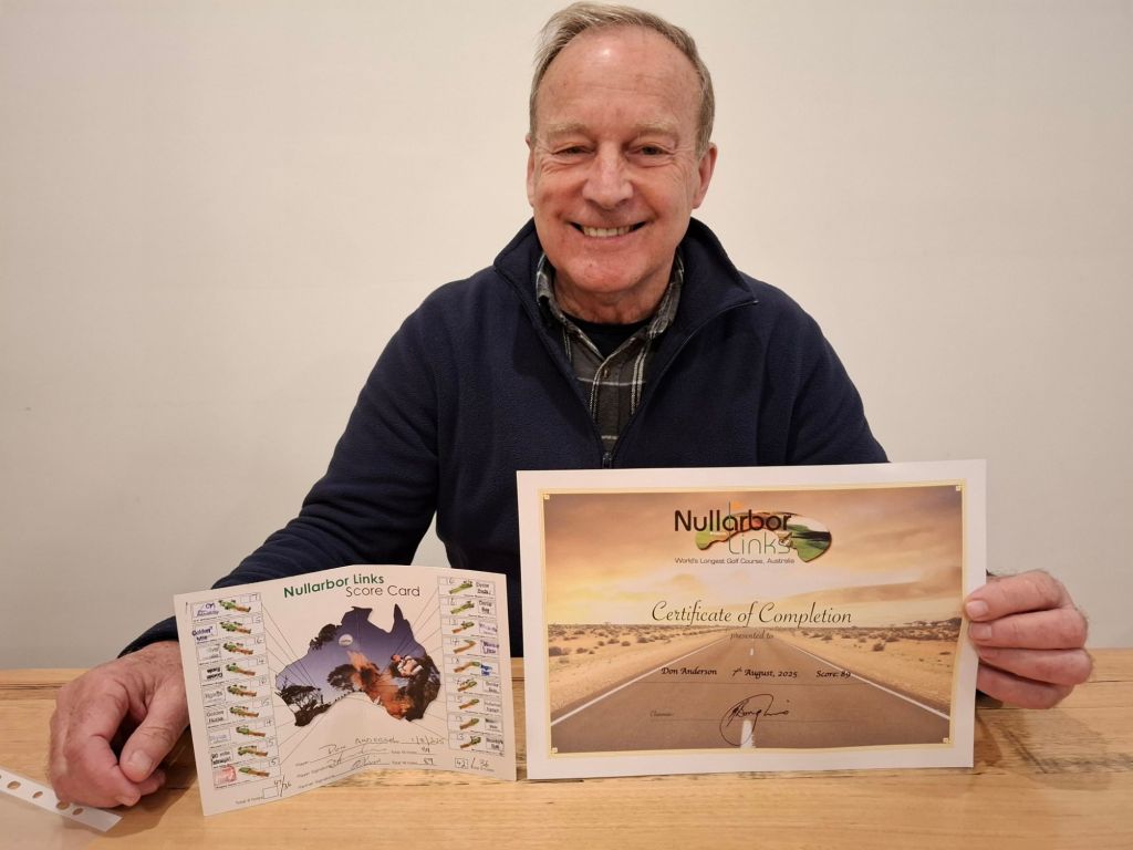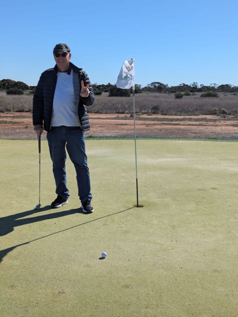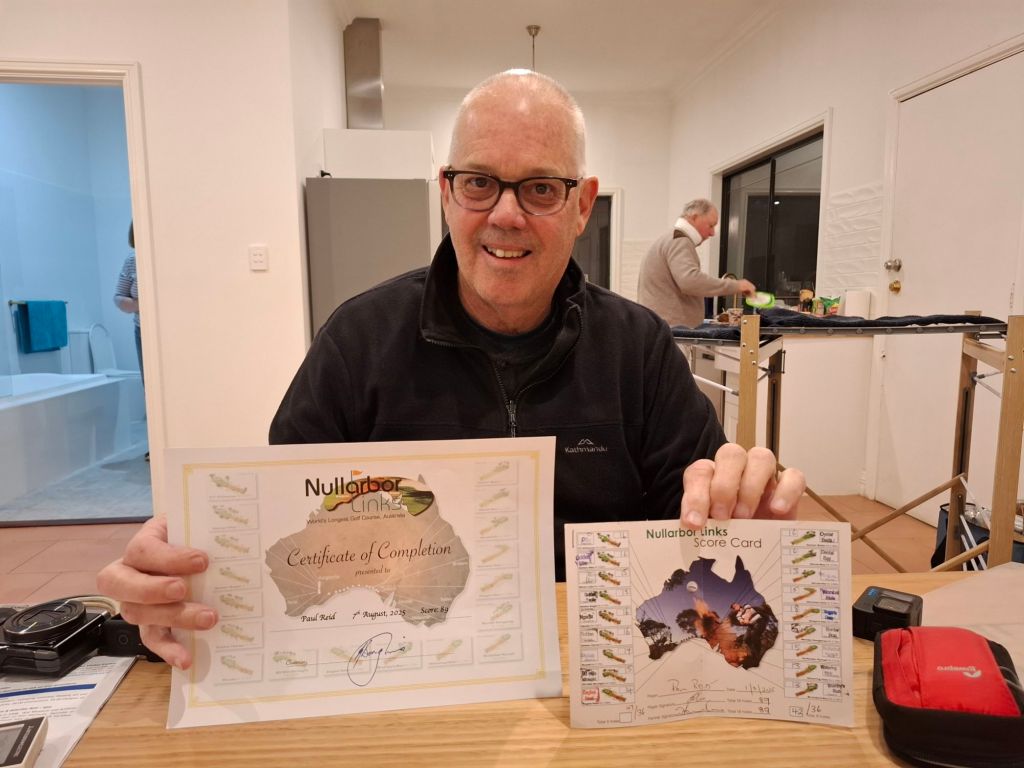 Propper Golf – The Don and Pauolo were tied and no play off hole was played. The only 2 to complete the 18 holes of the Nullabor Masters ( some as reality golf, some as virtual golf – you work it out) A dead heat. Harve played some holes, caddied others, gave sage advice and the odd hurtful comments about the quality of play and the course.