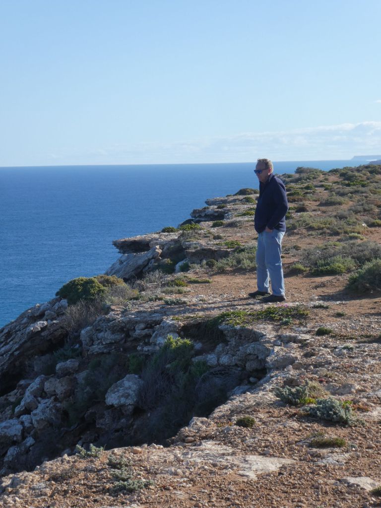 We reach the Head of the Bight Visitor Centre where we pay $17 each at the whale centre. We walk to the cliffs and there’s a sign saying there have been 12 mother whales and 12 calves. At first we think the lumps in the sea are rocks but they are whales, lots of them. Speckled and white calves, frollicking adults with tail flicks. Southern Right Whales we are advised, numbers are still revovering from the whaling days. Pretty extraordinary really.